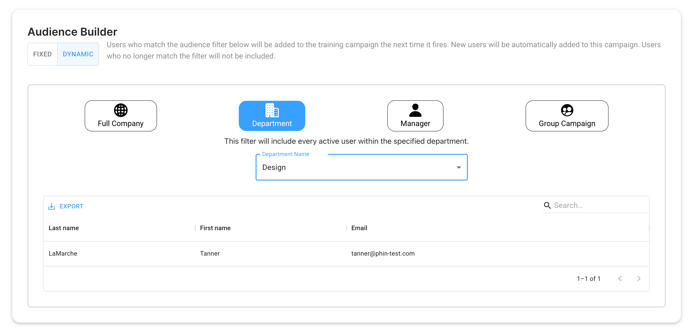 The department dynamic audience option allows you to deliver this campaign to a specific department within the company. Start by selecting a department in the dropdown to see the current user groups.