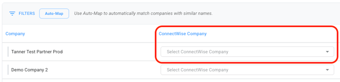- Auto-Map: When you click "Auto-Map," the button will turn grey, disabling itself from being clicked again, and the integration will attempt to find exact matches between your Phin company names and company names in your ConnectWise Manage account. The "Auto-Map" button is to the right of the "Filters" button. Depending on how many companies you have, this process can take up to a minute. You will know the process is over when you see the "ConnectWise Company" column populate with company names, and the Auto-Map button will no longer be disabled.