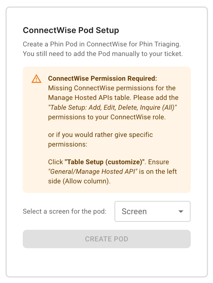 - If Phin does not have the proper access, a warning will be displayed. Find the API key you used to set up the ConnectWise integration and add the permissions mentioned in the message.