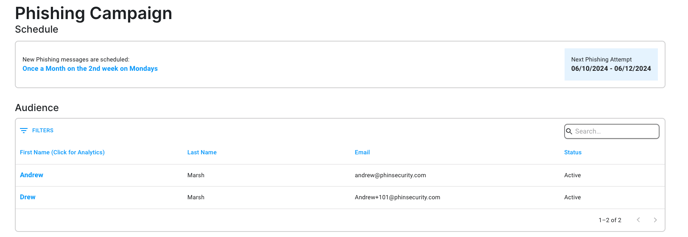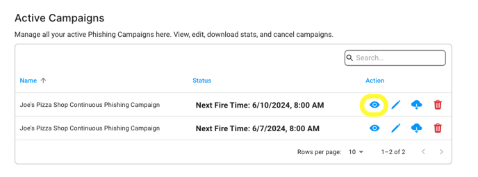 Phishing campaign details can be reviewed by using the eye icon in you Active Campaigns table.